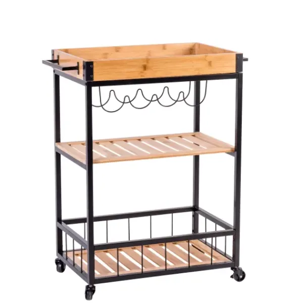 - Bandeja + Prateleiras: Bambu (China), Natural, Estrutura + Estante Vinho: Metal, Laca Em Pó